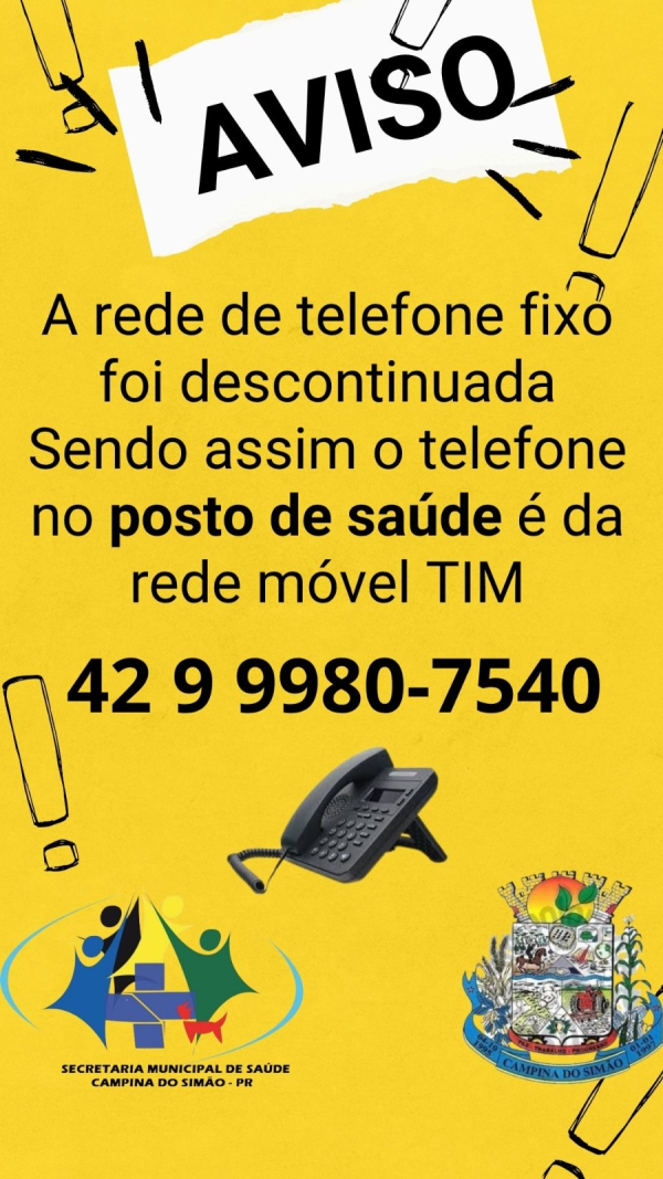 A SECRETARIA MUNICIPAL DE SAÚDE COMUNICA QUE, DEVIDO A PROBLEMAS COM A PRESTAÇÃO DE SERVIÇO DE TELEFONIA FIXA, ALTEROU OS NUMEROS DE TELEFONES AOS USUARIOS DOS SERVIÇOS DE SAÚDE, DO CENTRO MUNICIPAL DE SAÚDE E SERVIÇO DE TRANSPORTE DE PACIENTES, SENDO: