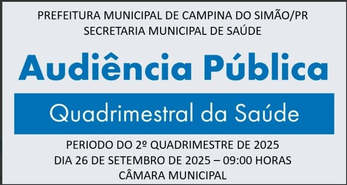 1. Convoca o Conselho Municipal de Saúde, os Representantes do Legislativo Municipal (Câmara Municipal), População em geral e a quem possa interessar, para Audiência Pública da Saúde referente às ações realizadas no 2º Quadrimestre de 2025, que será realizada no dia 26 de setembro de 2025, as 09:00 horas, nas dependências da Câmara Municipal de Vereadores, situada na Avenida João Ferreira Neves, S/N, Centro – Município de Campina do Simão, com a seguinte ordem do dia: