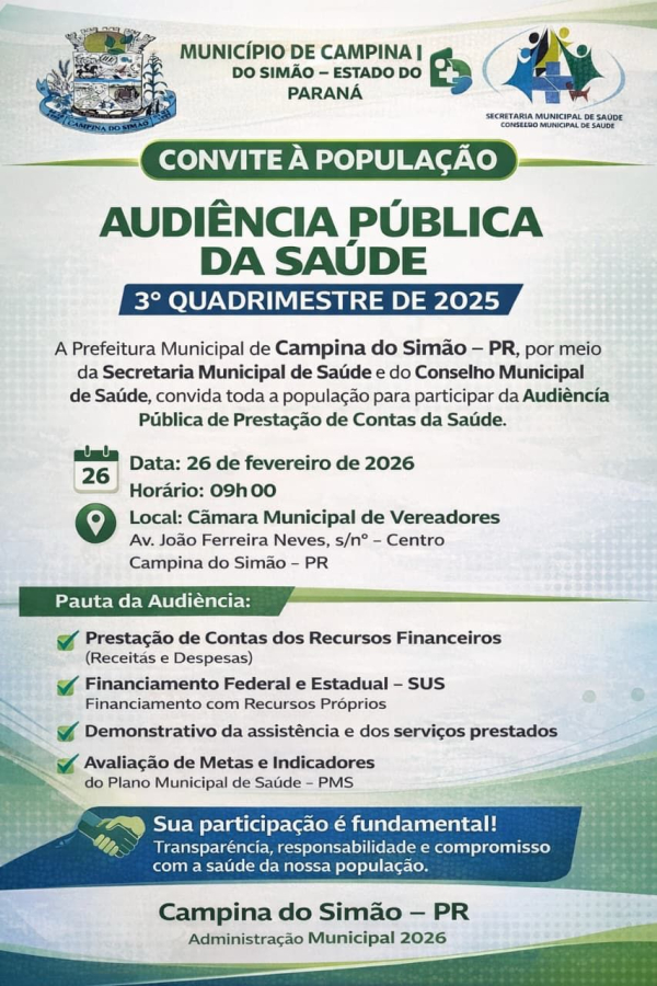 1. Convoca o Conselho Municipal de Saúde, os Representantes do Legislativo Municipal (Câmara Municipal), População em geral e a quem possa interessar, para Audiência Pública da Saúde referente às ações realizadas no 3º Quadrimestre de 2025, que será realizada no dia 26 de fevereiro de 2026, as 09:00 horas, nas dependências da Câmara Municipal de Vereadores, situada na Avenida João Ferreira Neves, S/N, Centro – Município de Campina do Simão, com a seguinte ordem do dia: